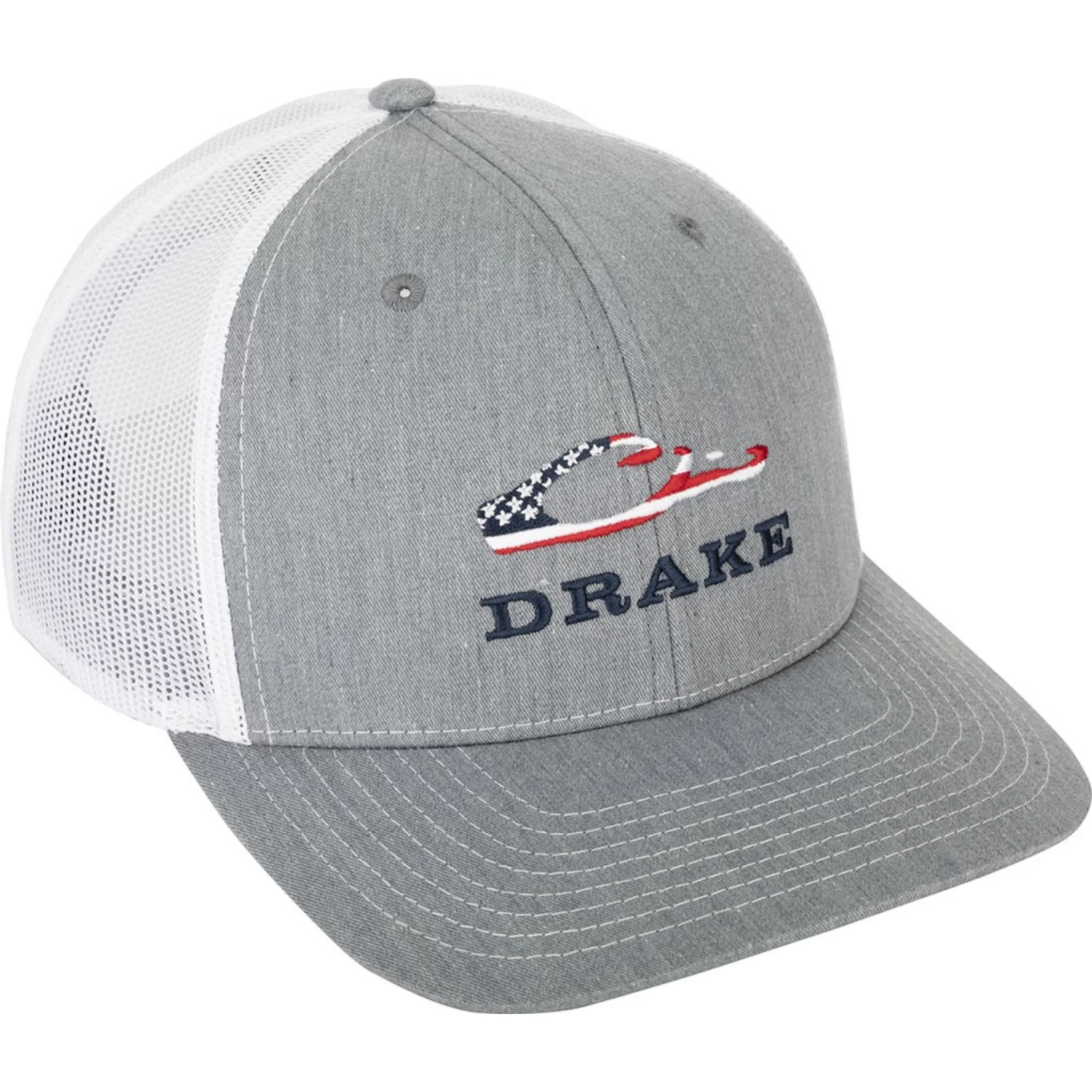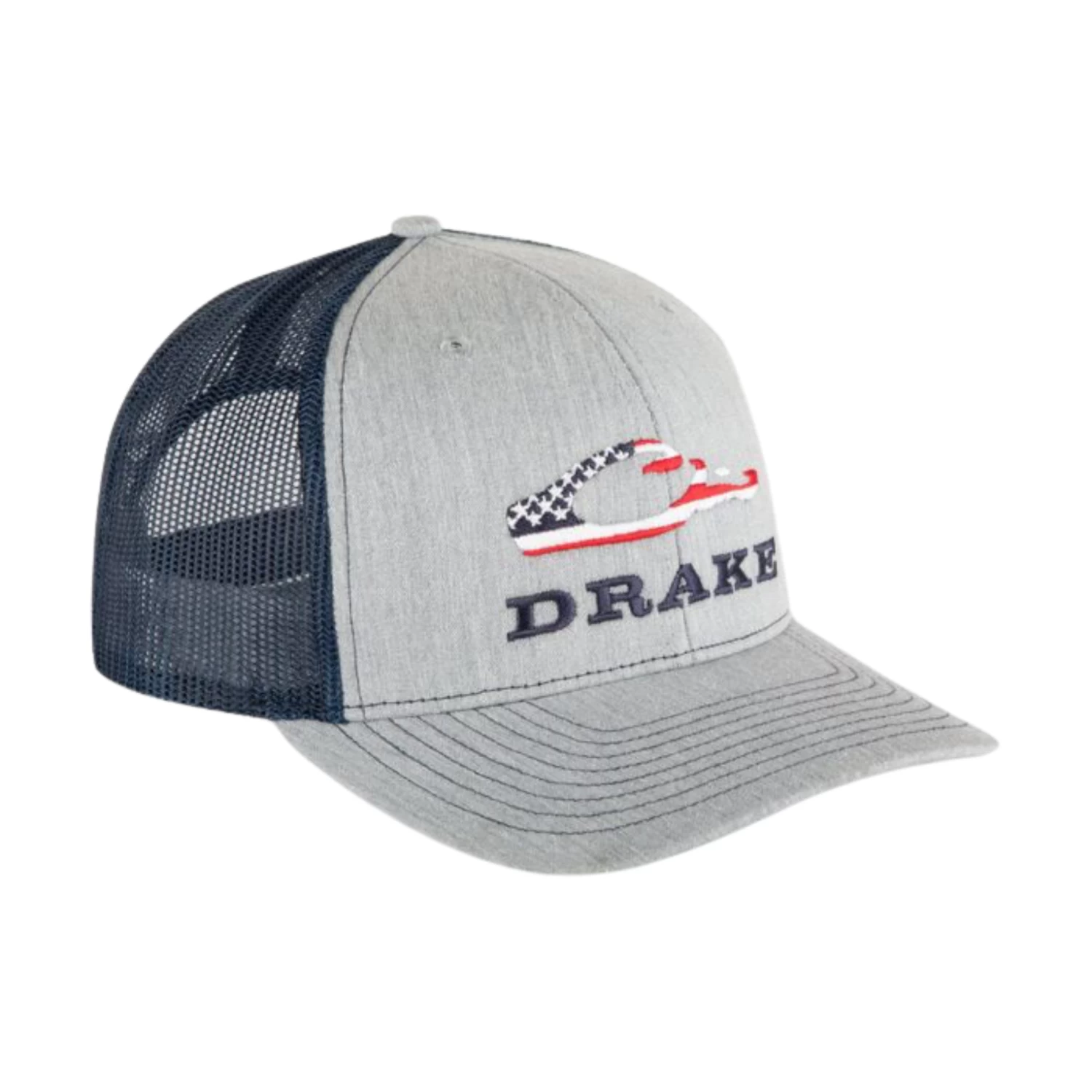 This classic trucker mesh-back cap style features a bold, American flag filled Drake head logo and the word Drake in Navy Blue below. Perfect for everyday wear, this cap is stylish, breathable, and comfortable.