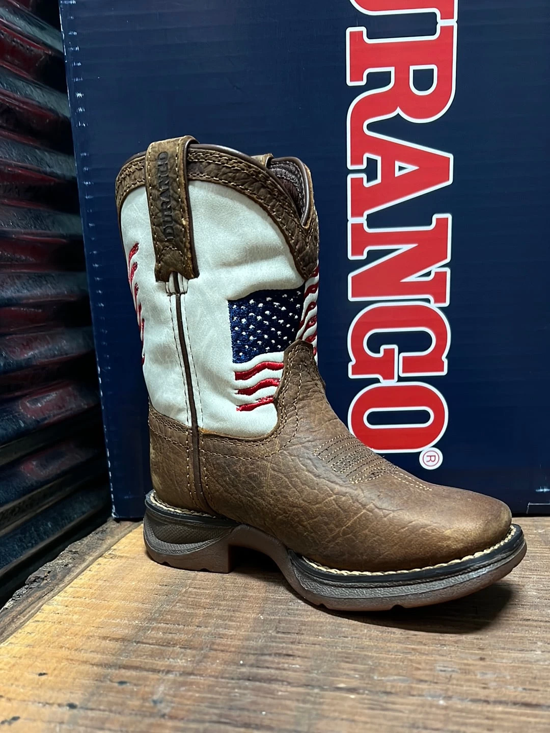 Lil’ Rebel American Flag Boot with Dark Brown foot, and White top. Sq. Toe, Rubber outsole.